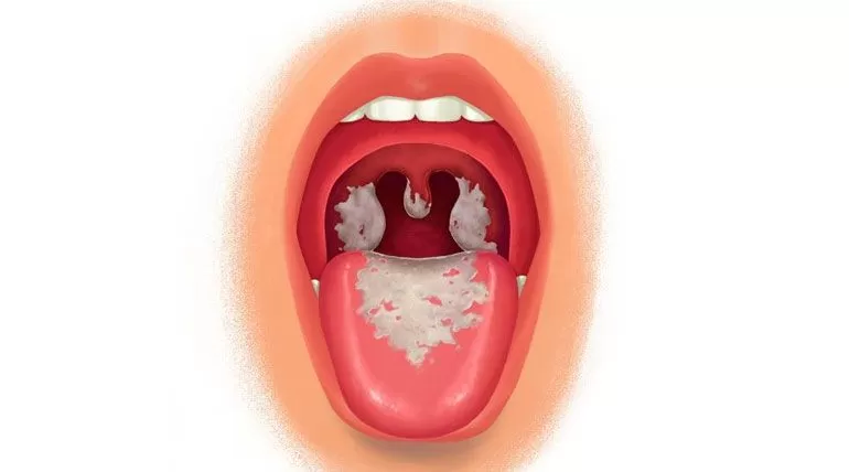 Đau họng và giả mạc: Họng hơi đỏ, nuốt đau. Quan sát thấy có các đốm trắng hoặc màng trắng dai dính ở amidan, lan rộng nhanh sau vài giờ.