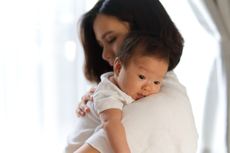 Bế bé áp sát vào người, để cằm của bé dựa nhẹ lên vai mẹ. Một tay mẹ đỡ mông bé, tay còn lại vỗ nhẹ hoặc xoa lưng.