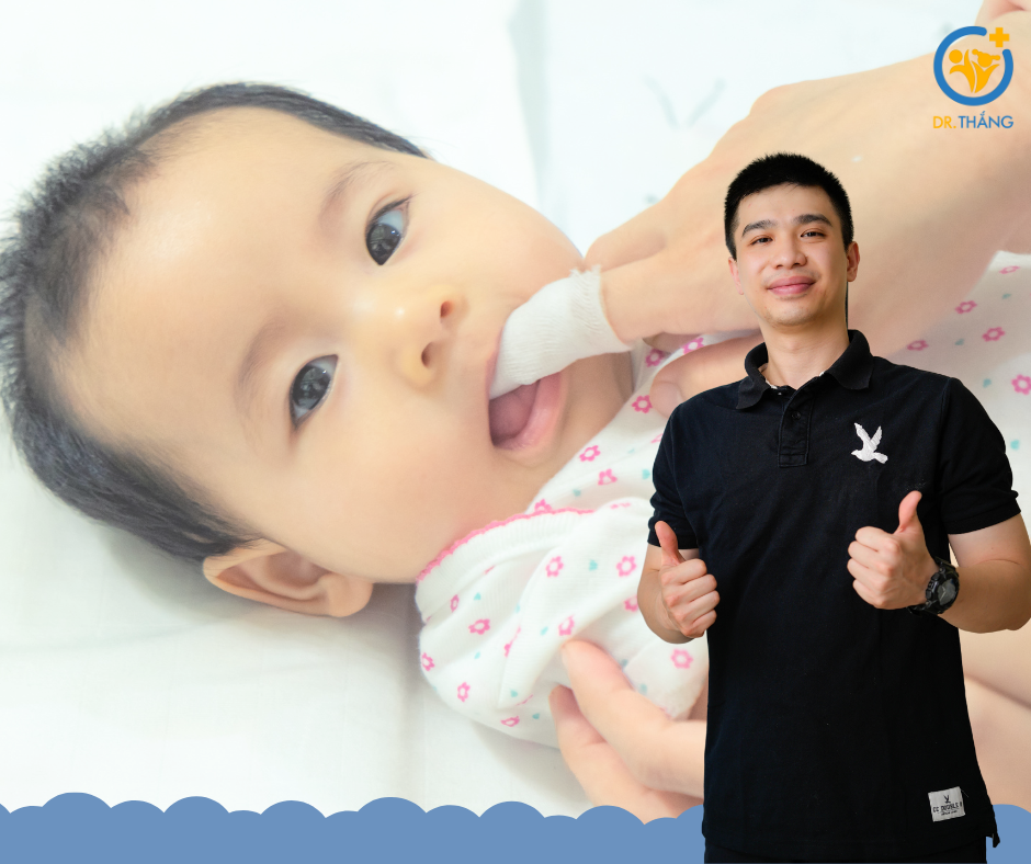 Cha mẹ quấn gạc thấm nước muối sinh lý quanh ngón trỏ để vệ sinh miệng cho con