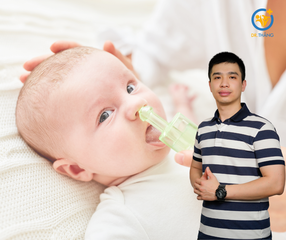 Dùng nước muối sinh lý: Nhỏ 1-2 giọt nước muối sinh lý (0,9% NaCl) vào mỗi bên mũi để làm loãng chất nhầy, sau đó hút nhẹ bằng dụng cụ hút mũi chuyên dụng.